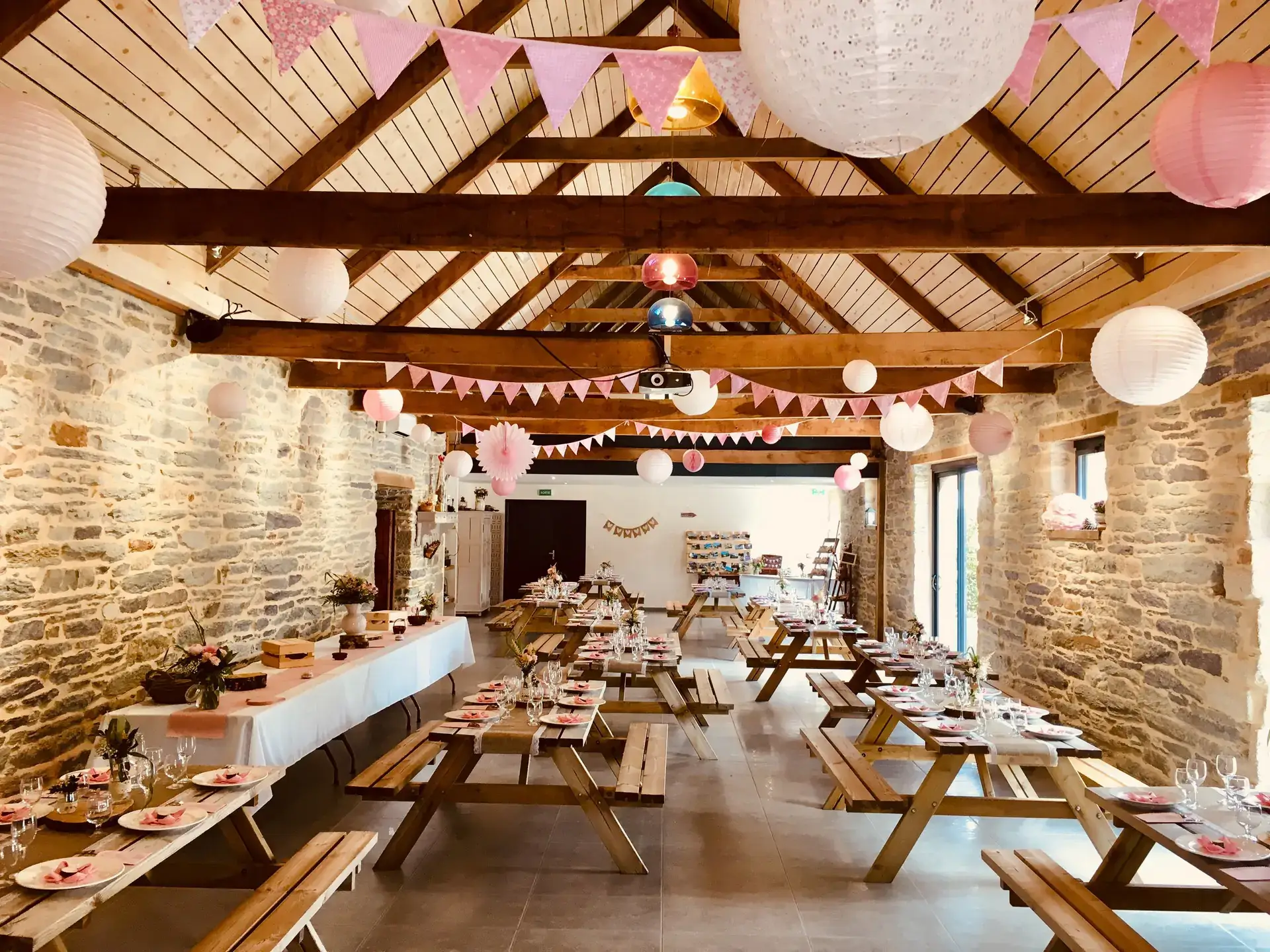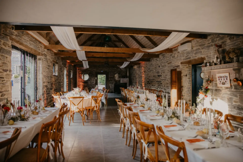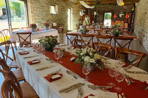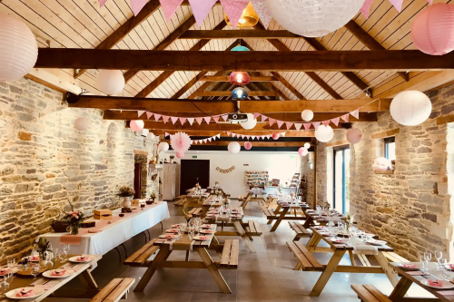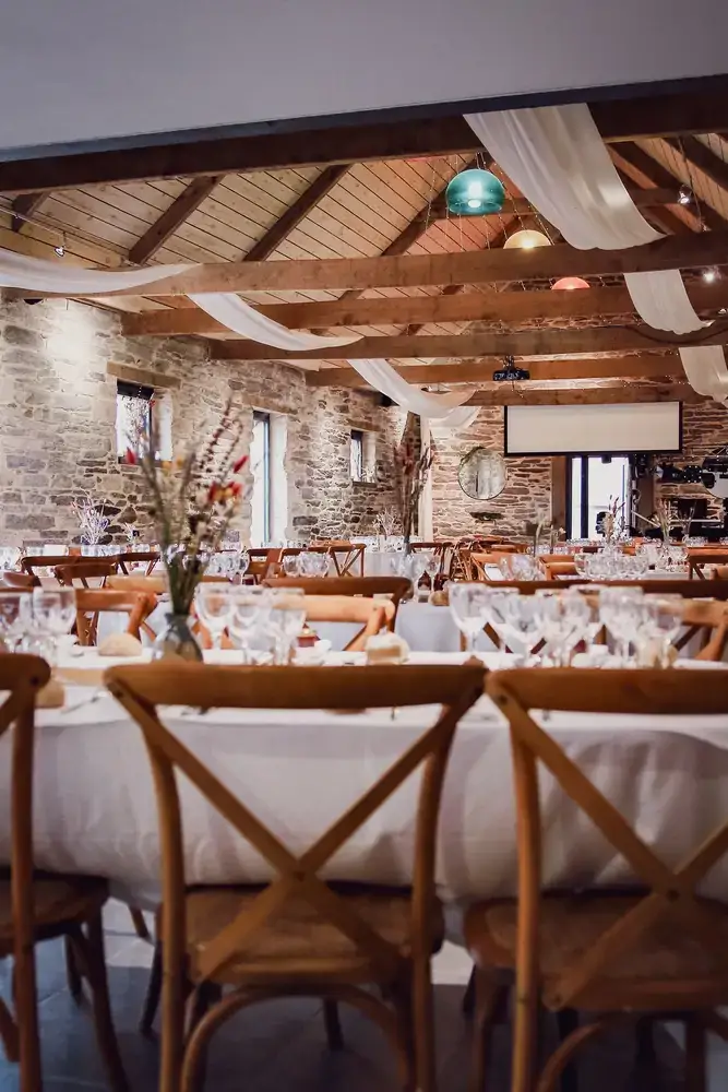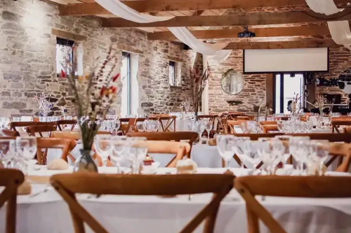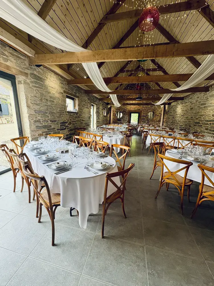 - Cette salle allie authenticité et convivialité grâce à ses poutres apparentes, sa hauteur sous plafond et ses murs de pierres ardoisées